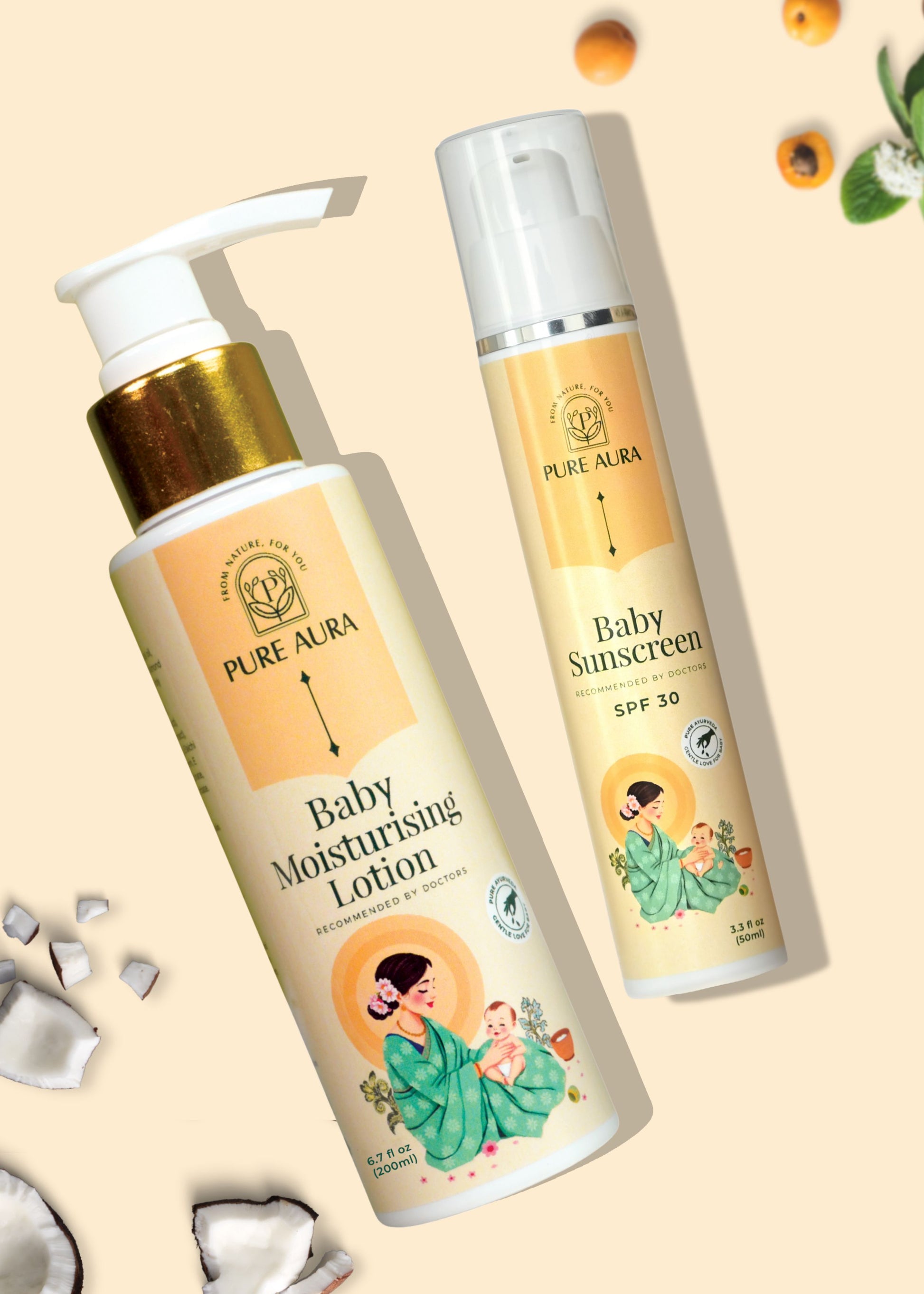 Baby Sunscreen: Protect your little one’s delicate skin with the gentle touch of nature. Pure Aura’s Baby Sunscreen is infused with Ayurvedic herbs and nourishing oils to provide safe, broad-spectrum sun protection without harsh chemicals. Lightweight and non-greasy, it soothes as it shields, making outdoor play worry-free and full of joy.